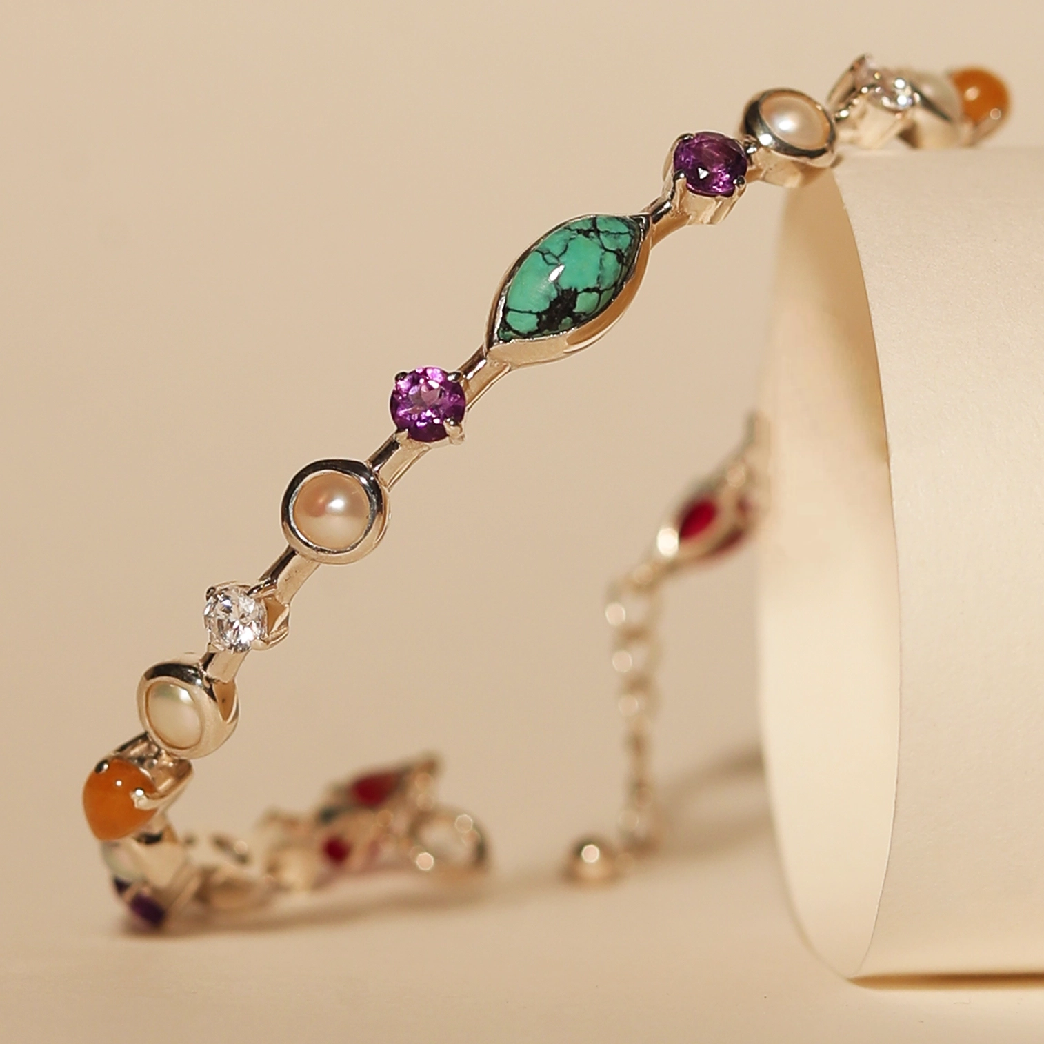 Handcrafted in 925 silver, Bold Spectrum is a striking multi-gemstone cuff bracelet created for women who embrace colour, confidence, and unapologetic individuality. At its centre sits a vivid turquoise stone, radiating strength and clarity, while an orbit of pearls, amethyst, yellow aventurine, and red quartz brings layers of richness and movement across the wrist. The design feels alive—each gemstone adding its own rhythm, energy, and brilliance to the composition.
