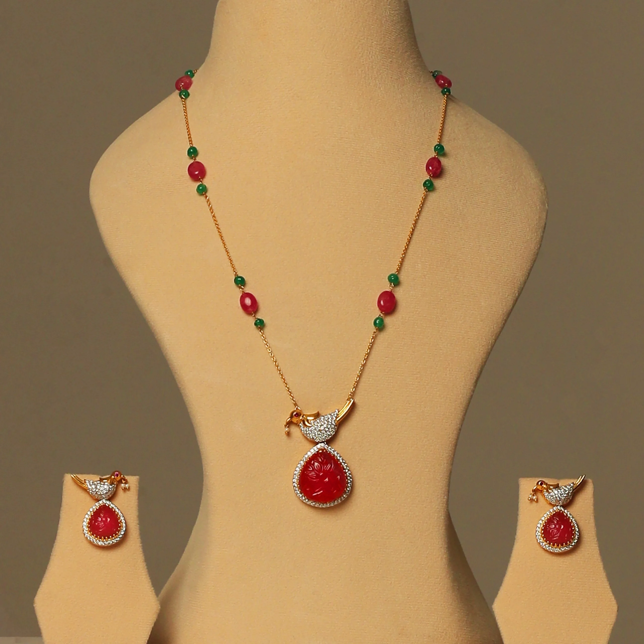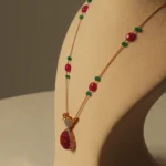 Handcrafted in 925 silver, this carved quartz necklace set brings a delicate yet modern charm to everyday elegance. The necklace features a graceful arrangement of carved red quartz beads paired with smooth green aventurine accents, creating a refreshing blend of warmth and cool tones. At the centre hangs a beautifully carved quartz pendant framed with minimal gold-accented detailing, adding a refined sophistication without overpowering the design.