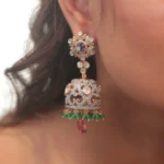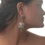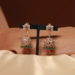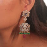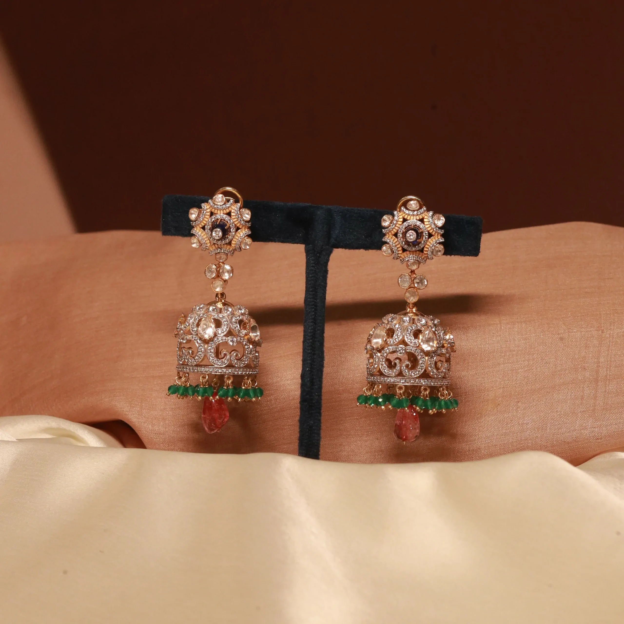 The intricate dome is encrusted with hand-set cubic zirconia and polki-style stones, forming ornate motifs that glisten with every movement. A crown-like floral top connects to the jhumka via delicate stone links, adding rhythm and fluidity to the design. What sets these earrings apart is the fringe of green quartz drops and a center red quartz dangler, creating a dramatic finish rooted in rich tradition and gemstone energy.