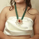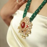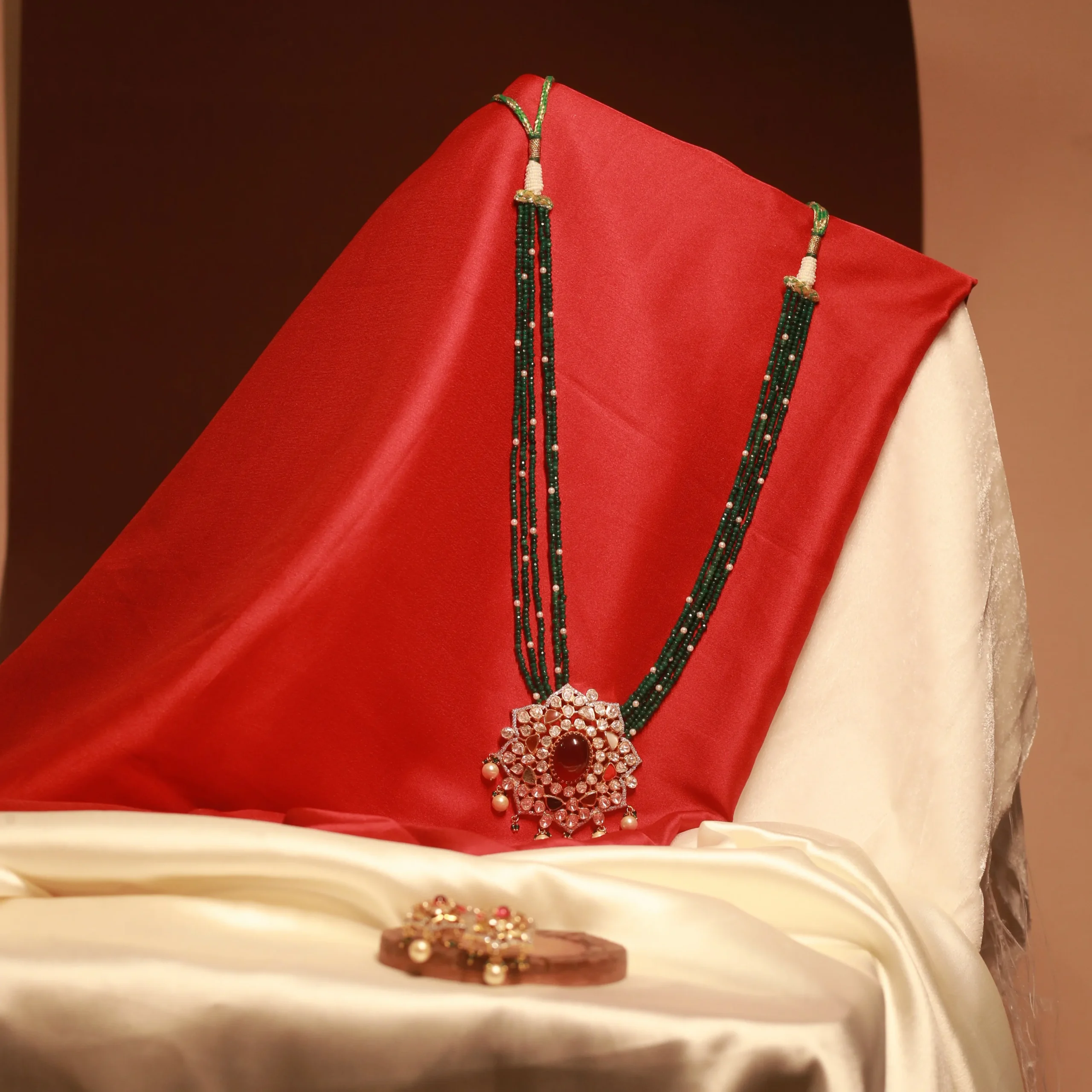The centrepiece bursts with the beauty of semi-precious Navratan stones—each representing celestial energies, set meticulously in a handcrafted pendant. Strung in layers of green quartz and pearls, the chain flows with royal elegance, bringing structure and softness together in perfect harmony.