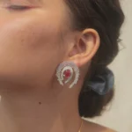 Lined with hundreds of micro-set rose quartz stones, the outer edge glows with soft, romantic energy—delicate yet dazzling. At the heart of each earring sits a striking red quartz, anchoring the piece with depth, fire, and quiet strength.
